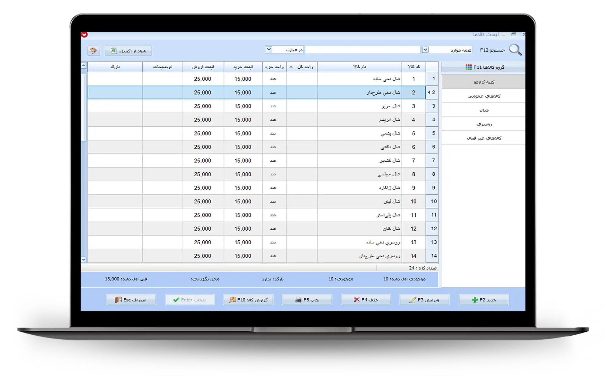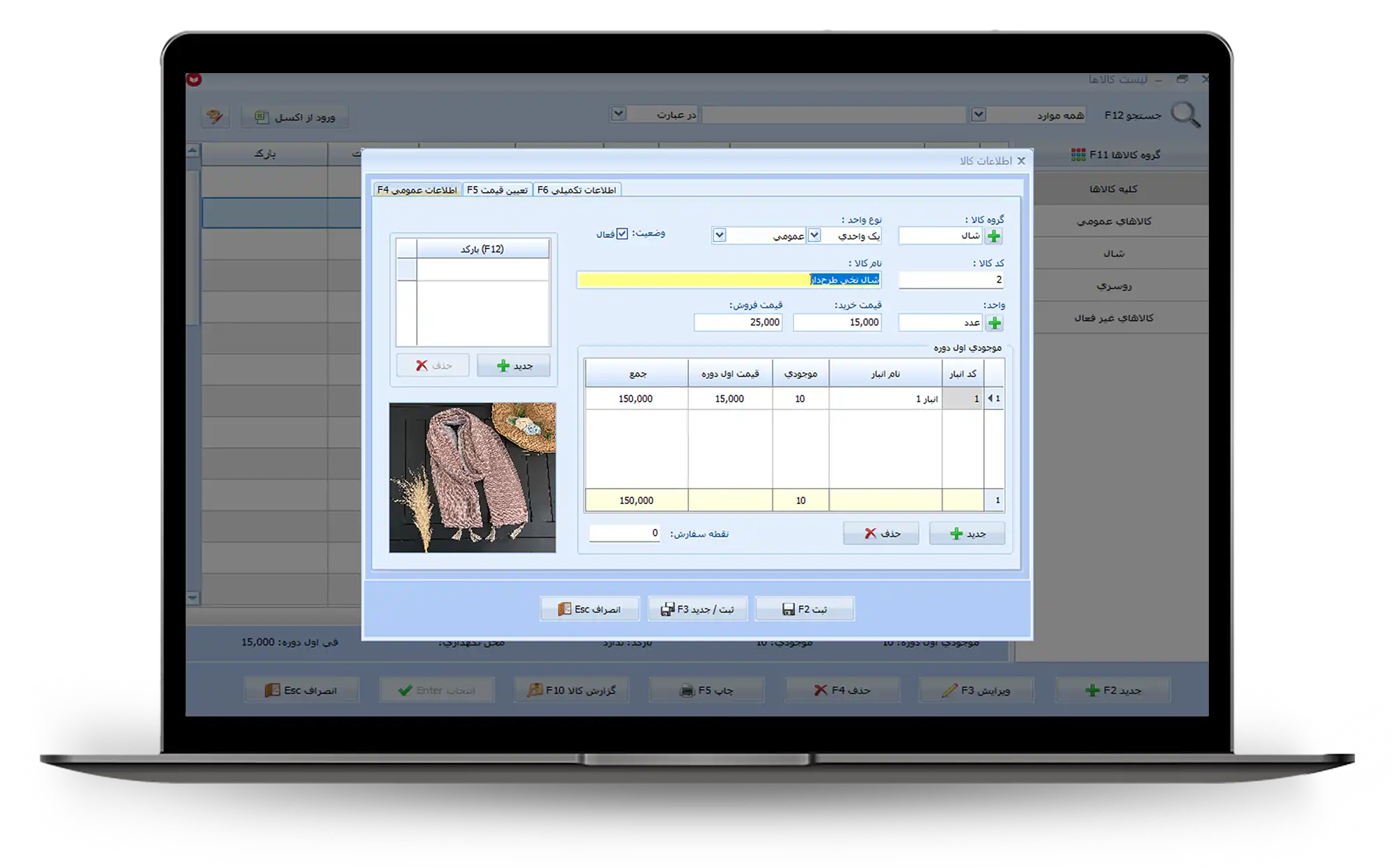 - هر کالا (شال یا روسری) را با مشخصاتی مثل مدل، رنگ، جنس، طرح و برند تعریف کنید تا مدیریت کالاها دقیقتر باشد.