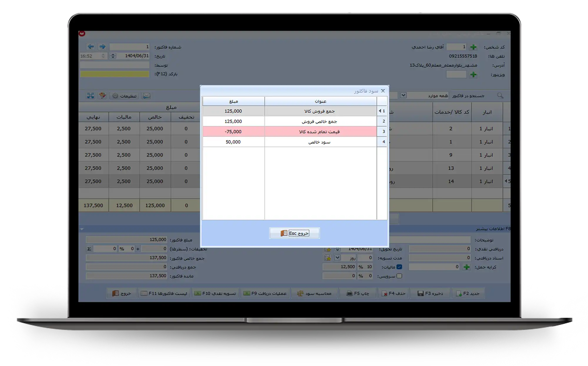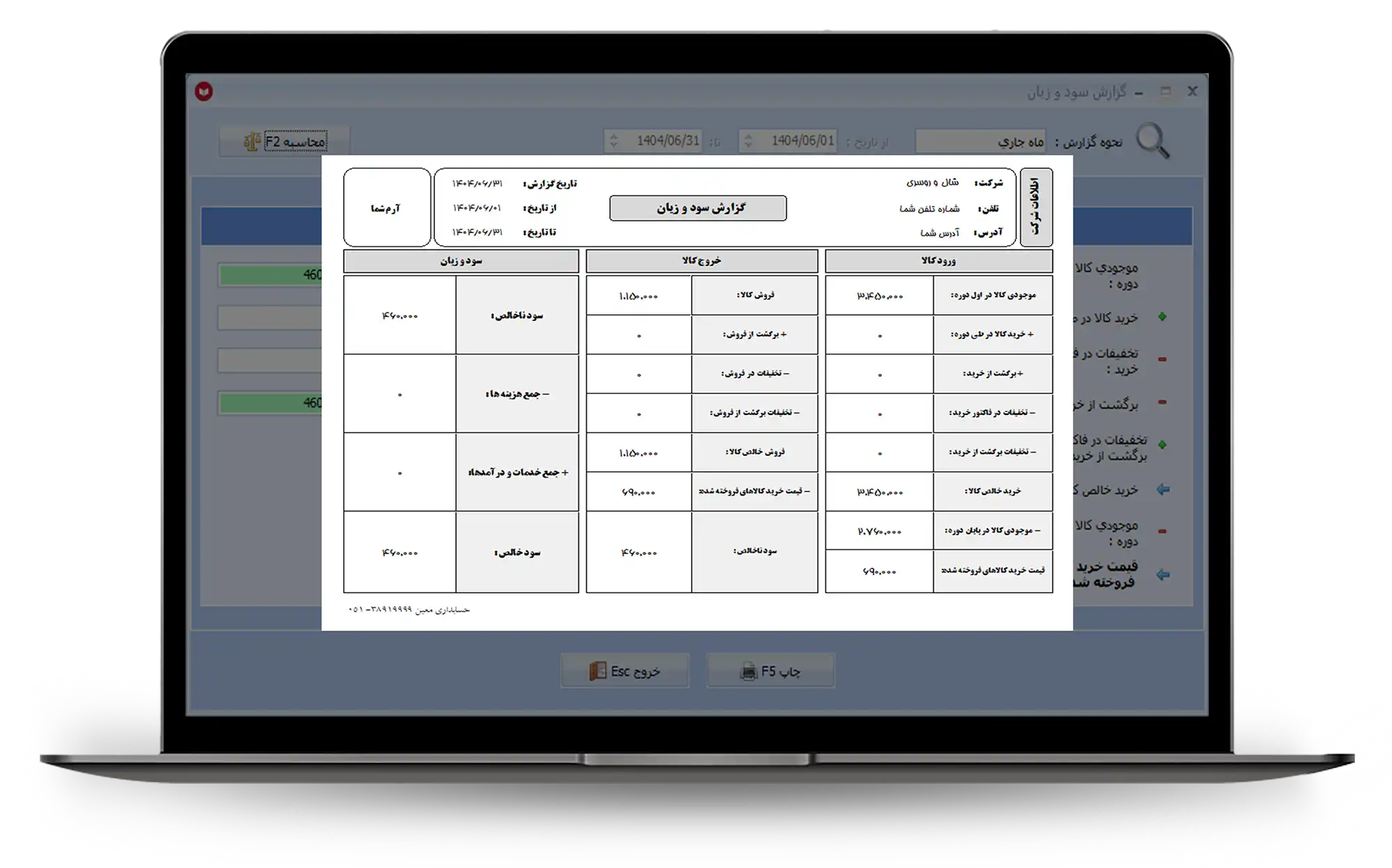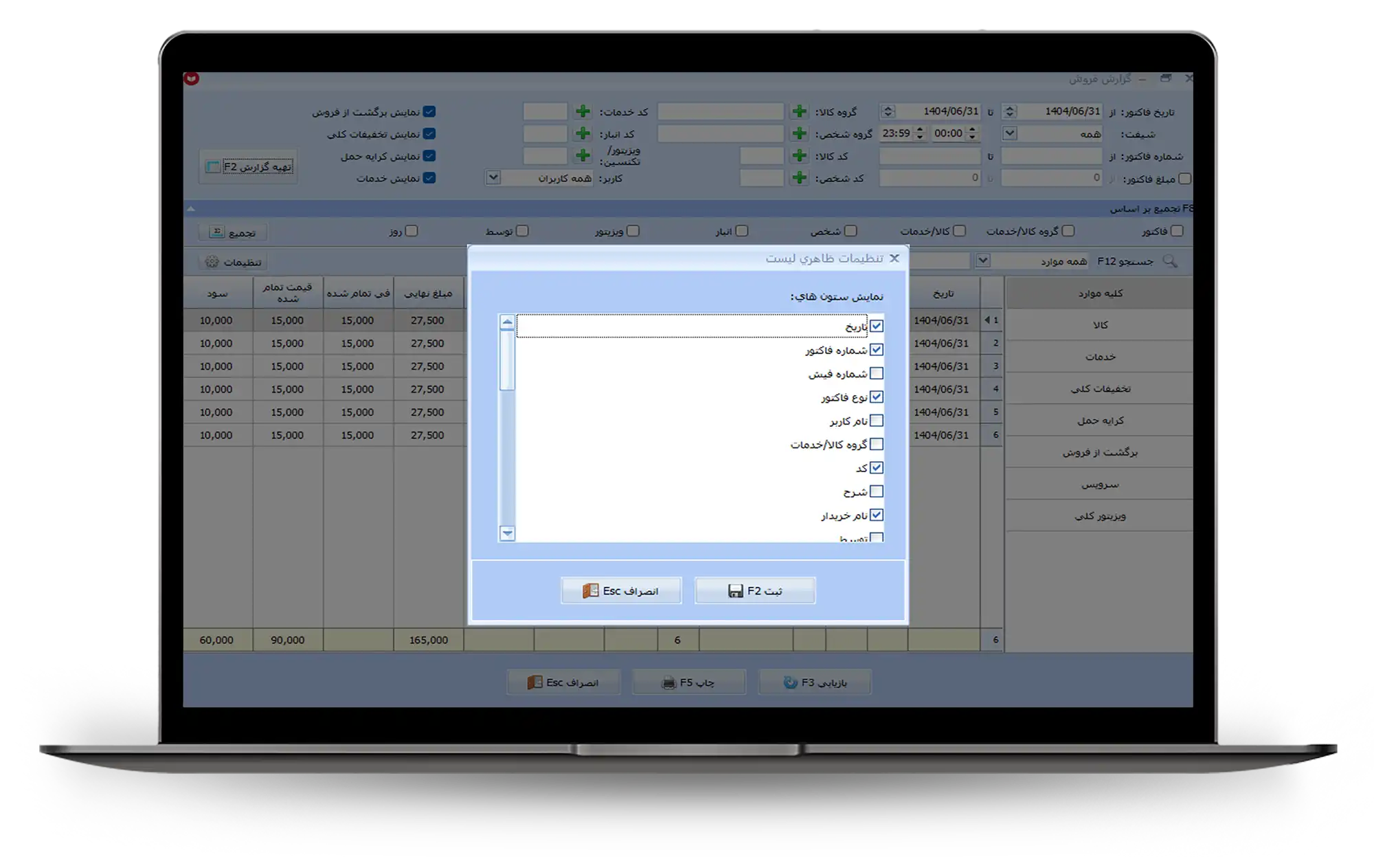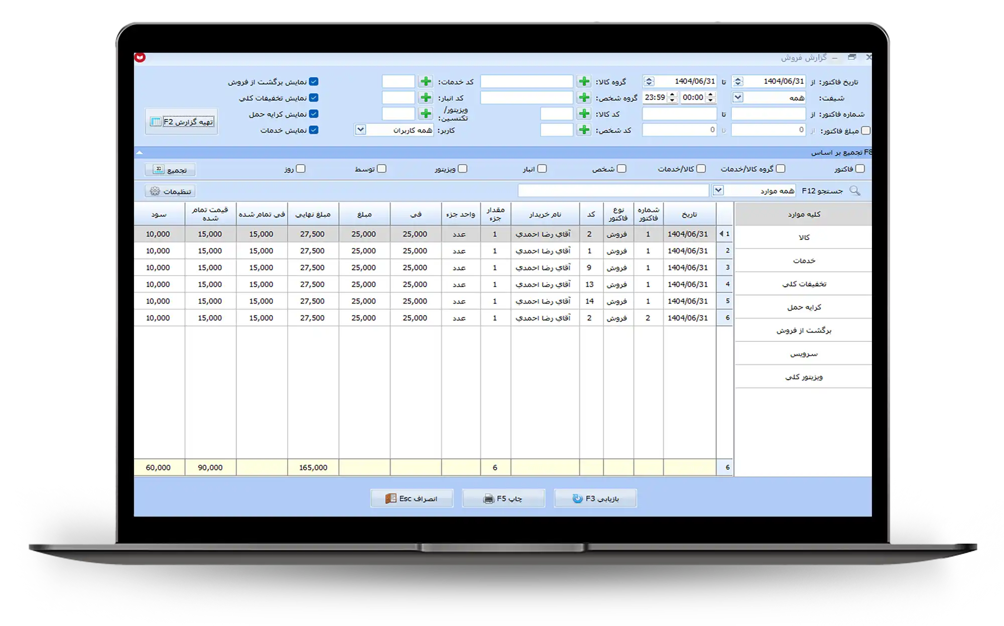 - امکان ارائه گزارش فروش روزانه، ماهانه یا بین دو تاریخ مشخص (همراه با نمایش حاشیه سود هر فاکتور)