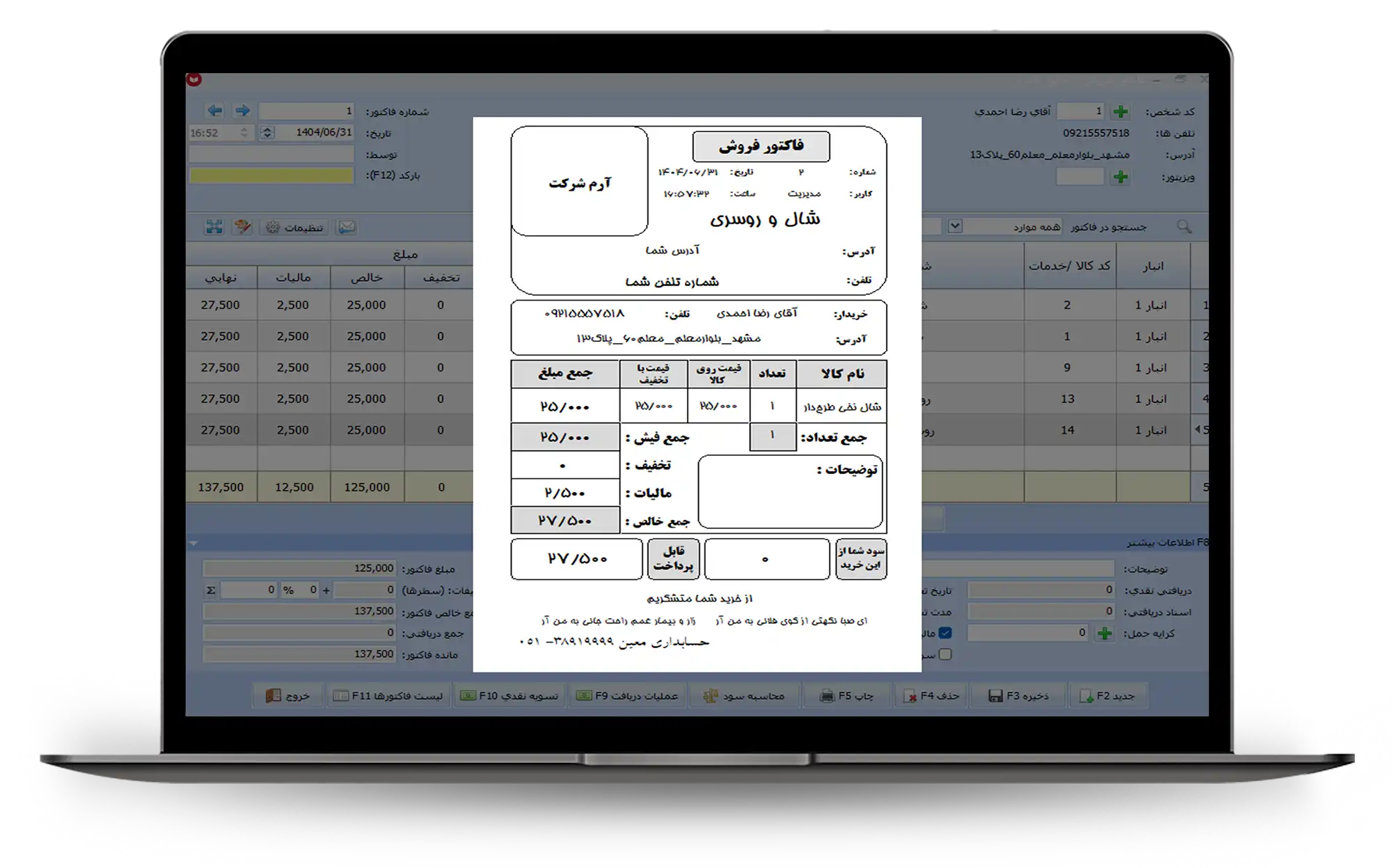 - برای مشتریان میتوانید فاکتورهای حرفهای با جزئیات کالا، قیمت، تخفیف، مالیات و شرایط پرداخت صادر کنید.