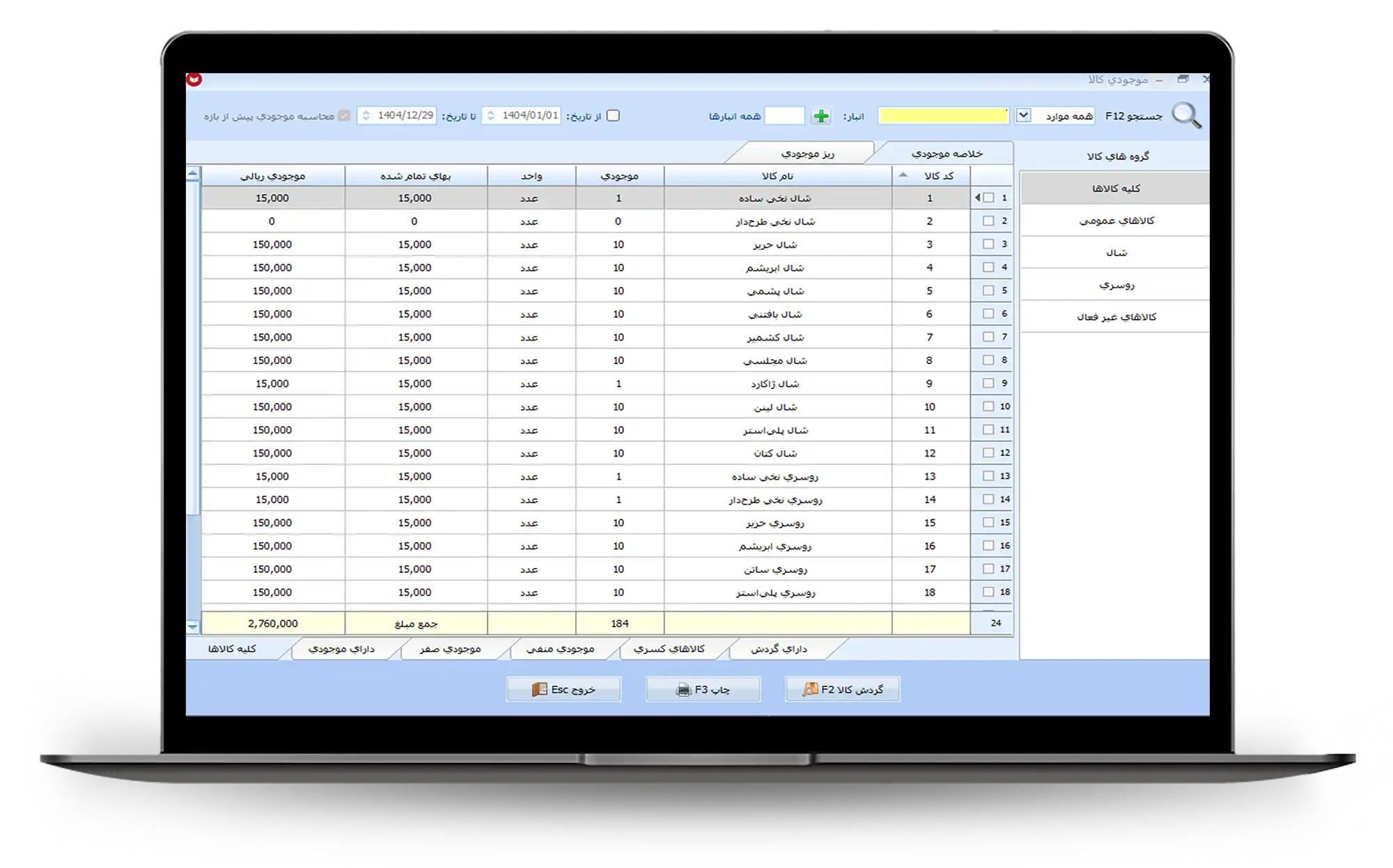 - امکان ارائه گزارش پرفروش ترین و کم فروش ترین کالاها به صورت صعودی یا نزولی