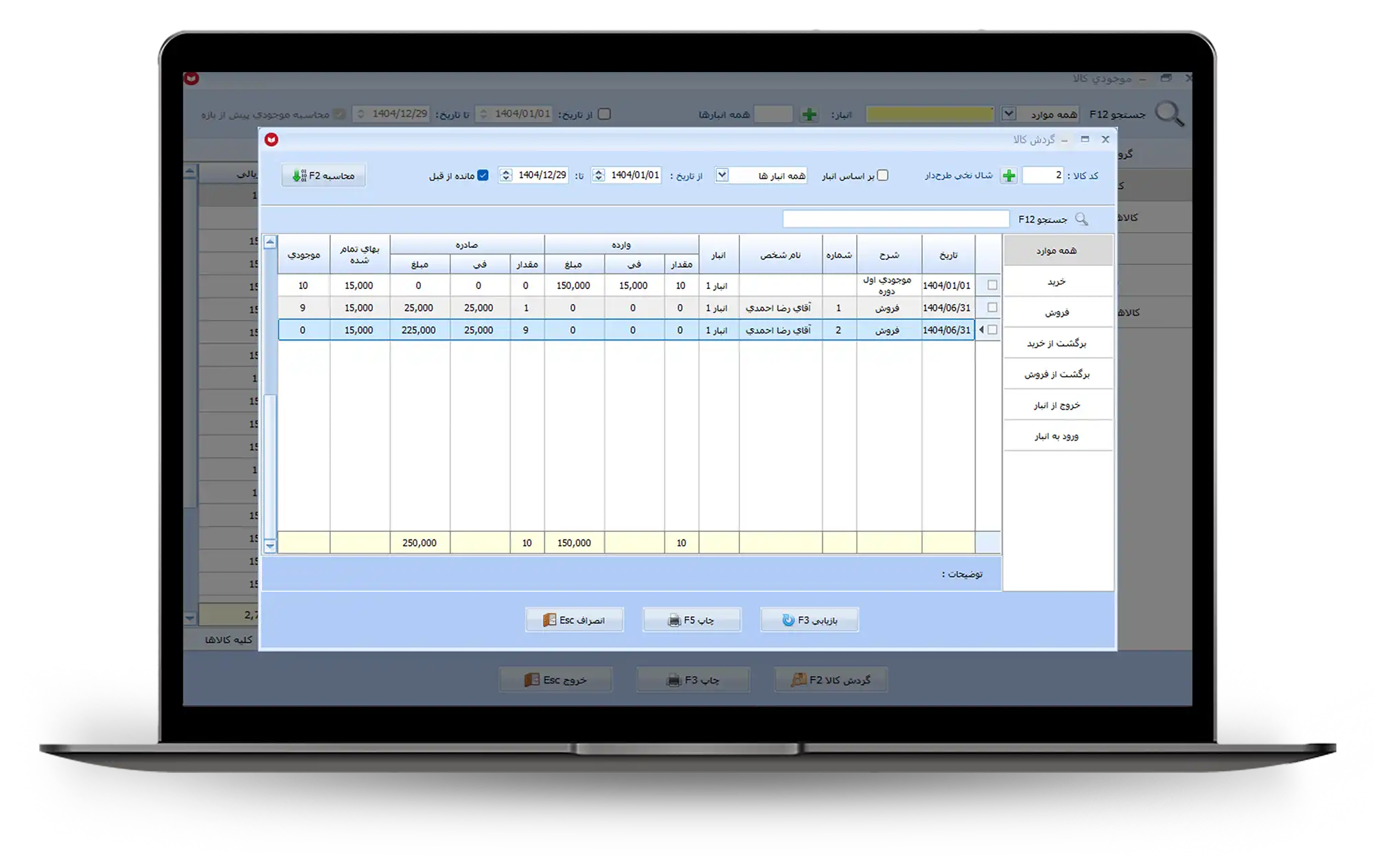 - ارائه گزارشهای متنوع مدیریت موجودی شامل موجودی انبارها، کالاهای بدون موجودی یا مازاد، کالاهای امانی و کاردکس کامل گردش کالا
