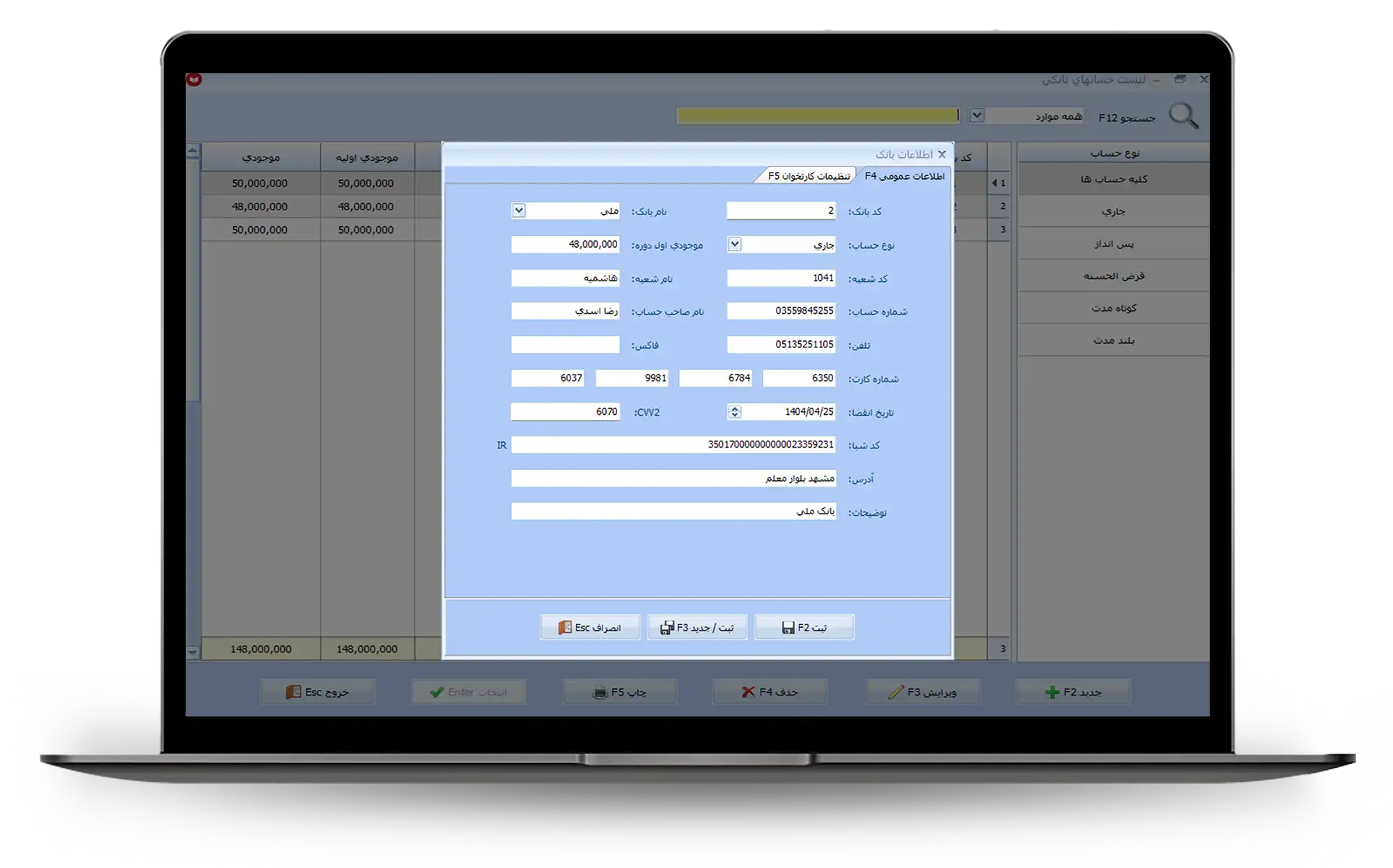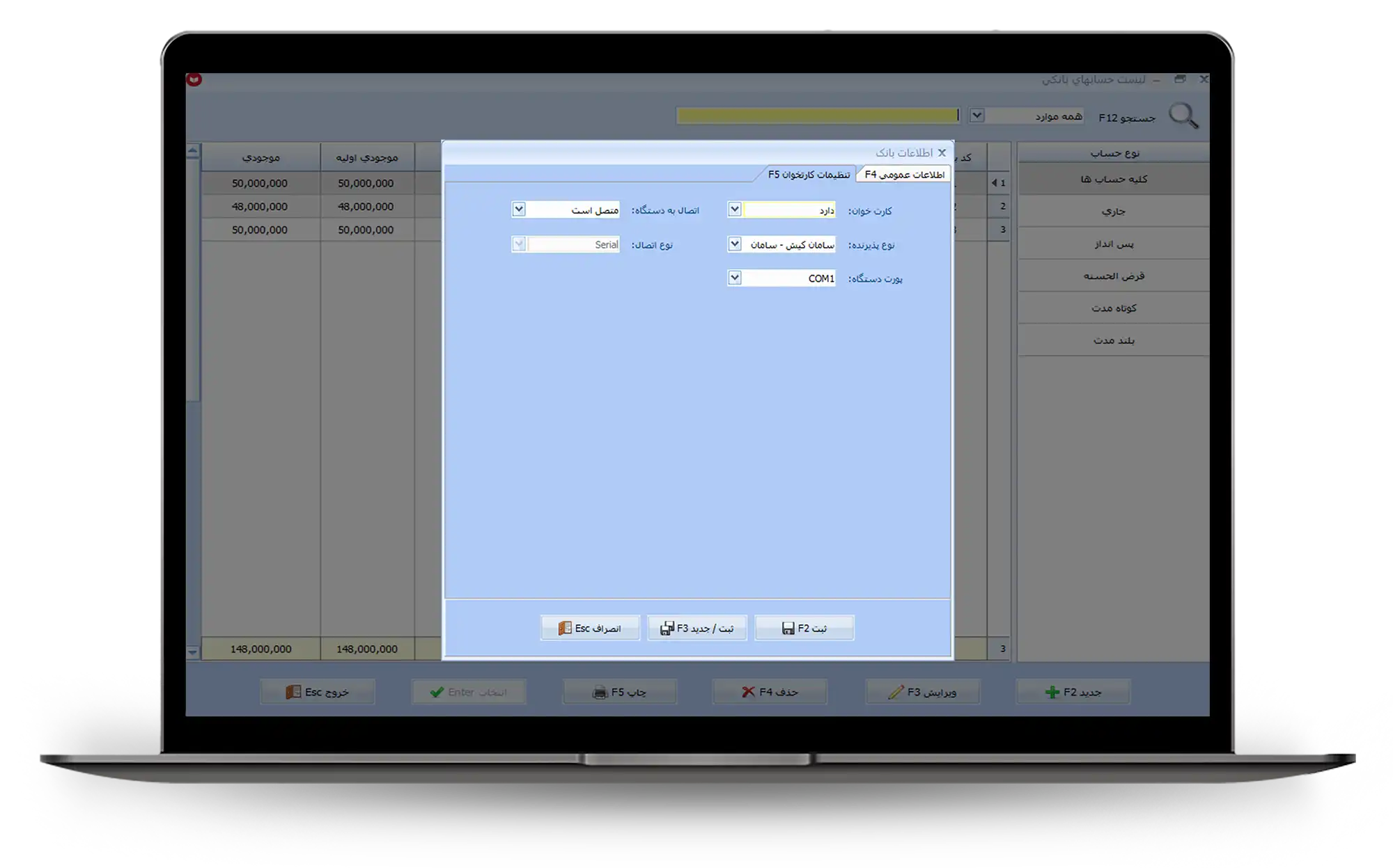 - امکان تعریف دستگاه های کارتخوان (POS) برای هر حساب بانکی