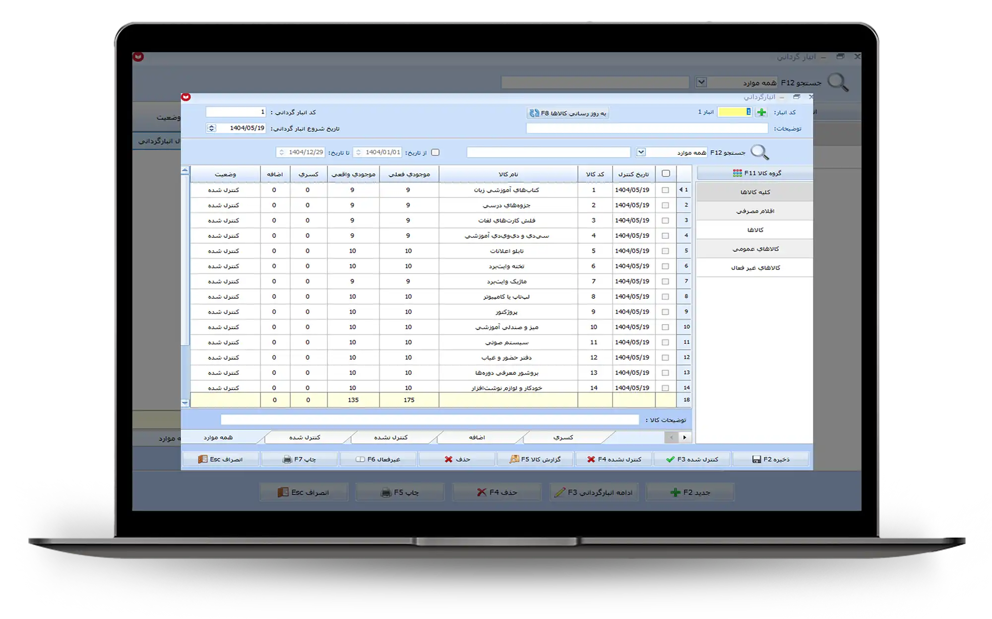 - تفکیک وضعیت کالاها به دسته های کنترل شده، کنترل نشده، کسری و اضافی در انبارگردانی