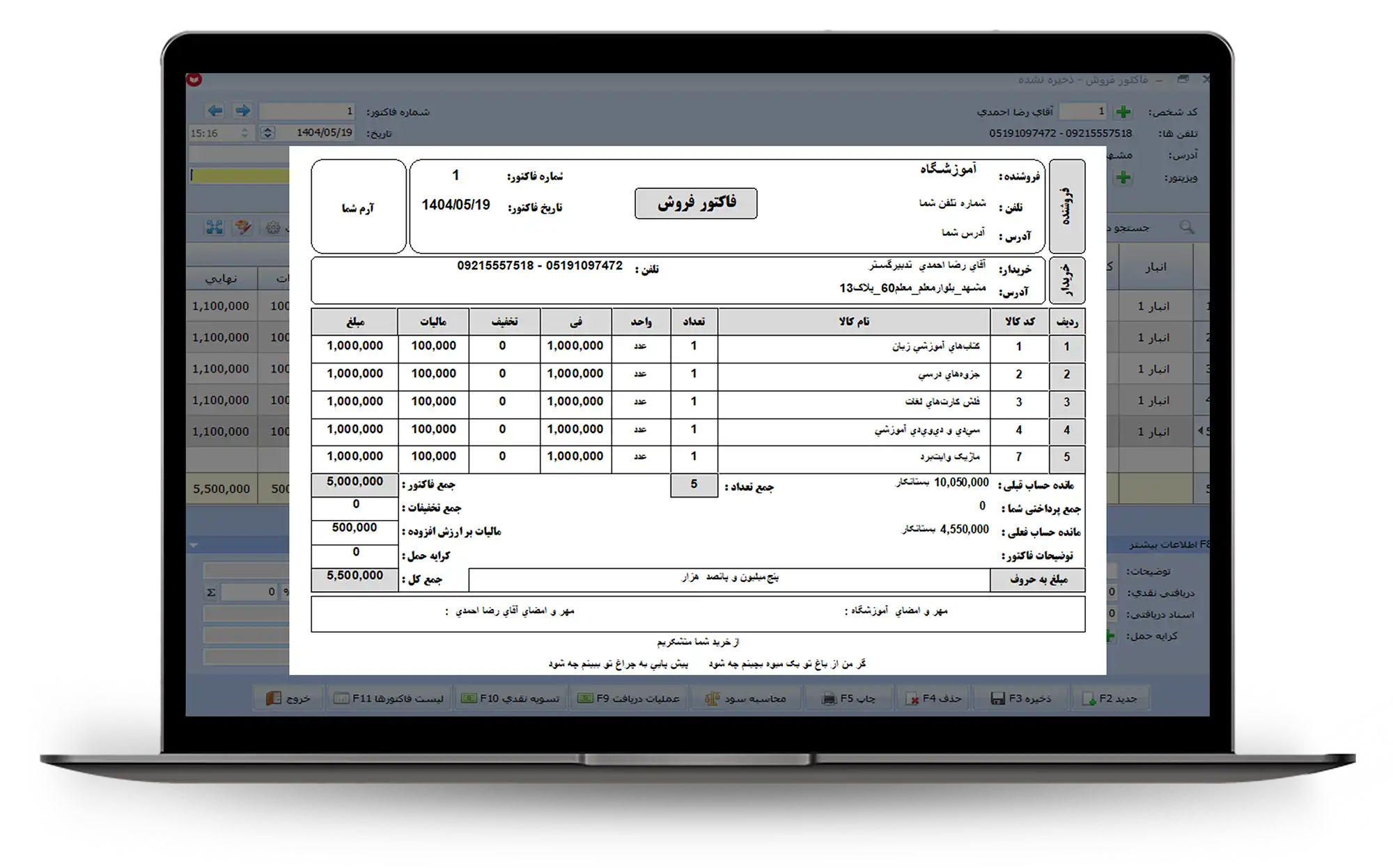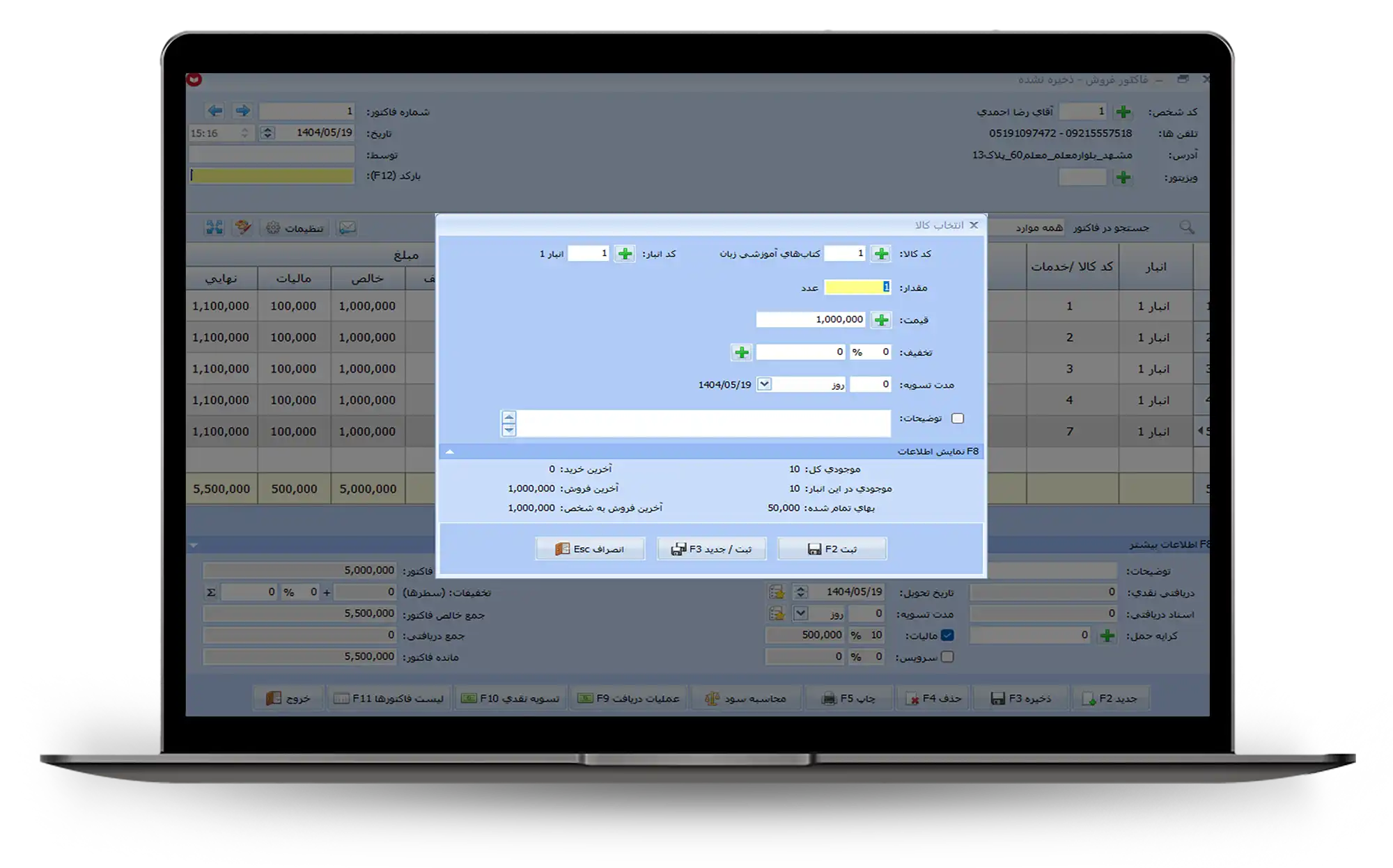 - صدور و مدیریت انواع فاکتور فروش و خرید با امکان تغییر قیمت کالا ها حین صدور فاکتور