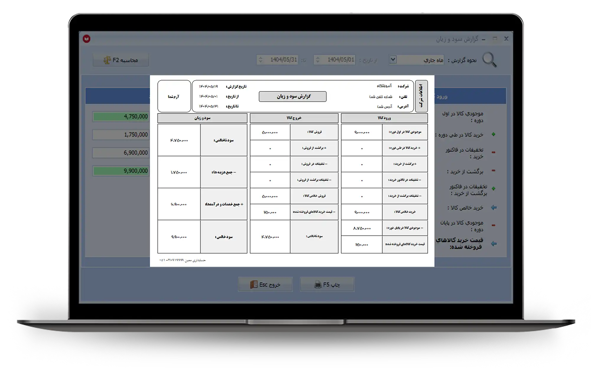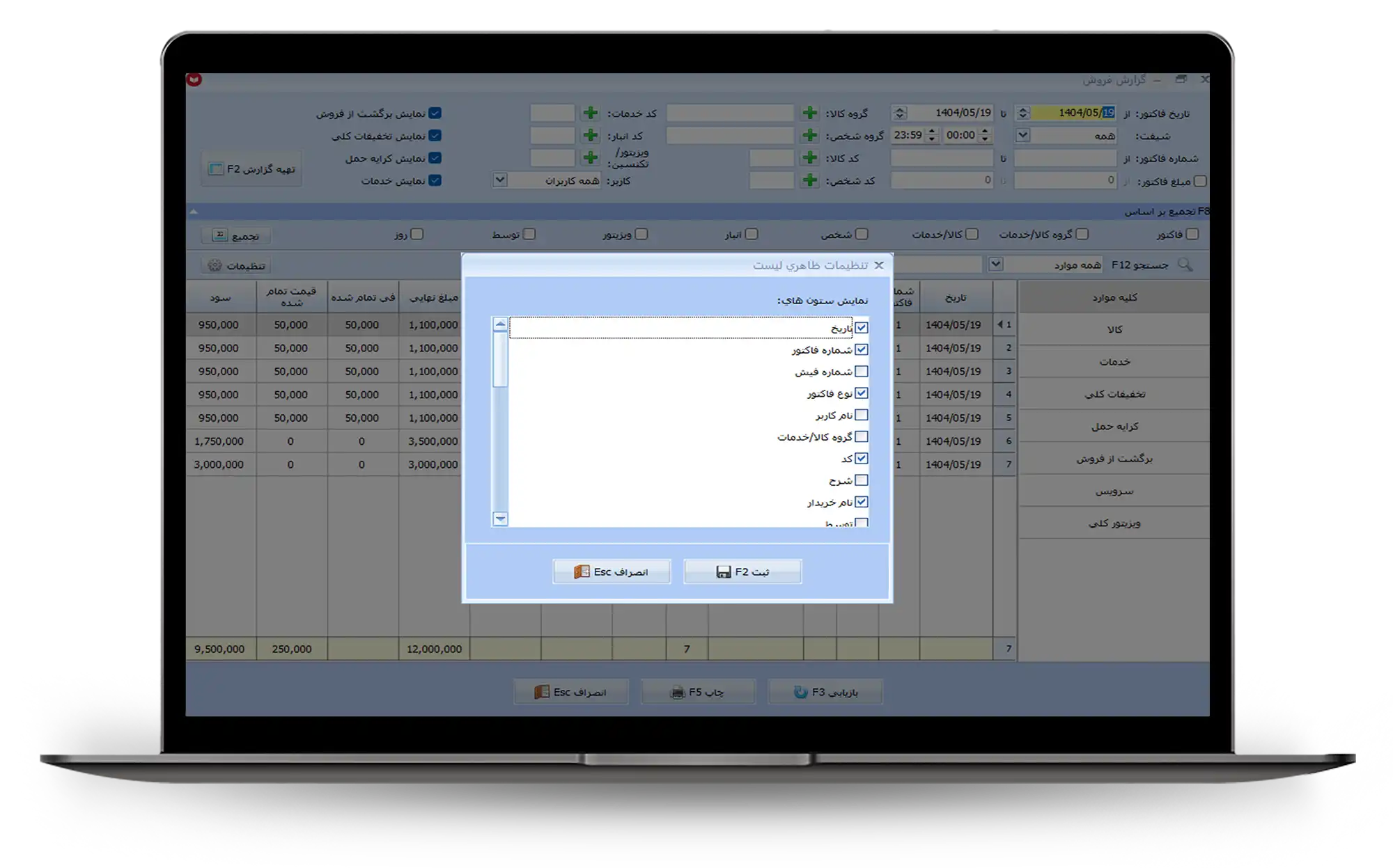 - امکان ارائه گزارش فروش روزانه، ماهانه یا بین دو تاریخ مشخص (همراه با نمایش حاشیه سود هر فاکتور)