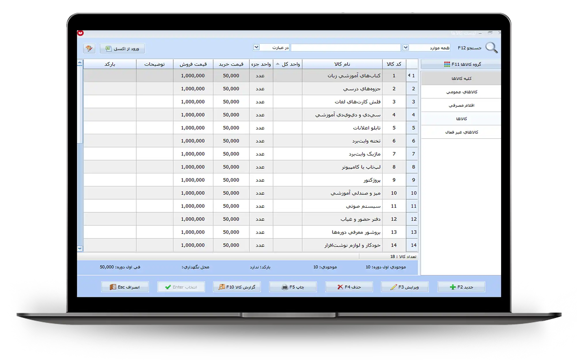 - ارائه گزارشهای متنوع مدیریت موجودی شامل موجودی انبارها، کالاهای بدون موجودی یا مازاد، کالاهای امانی و کاردکس کامل گردش کالا