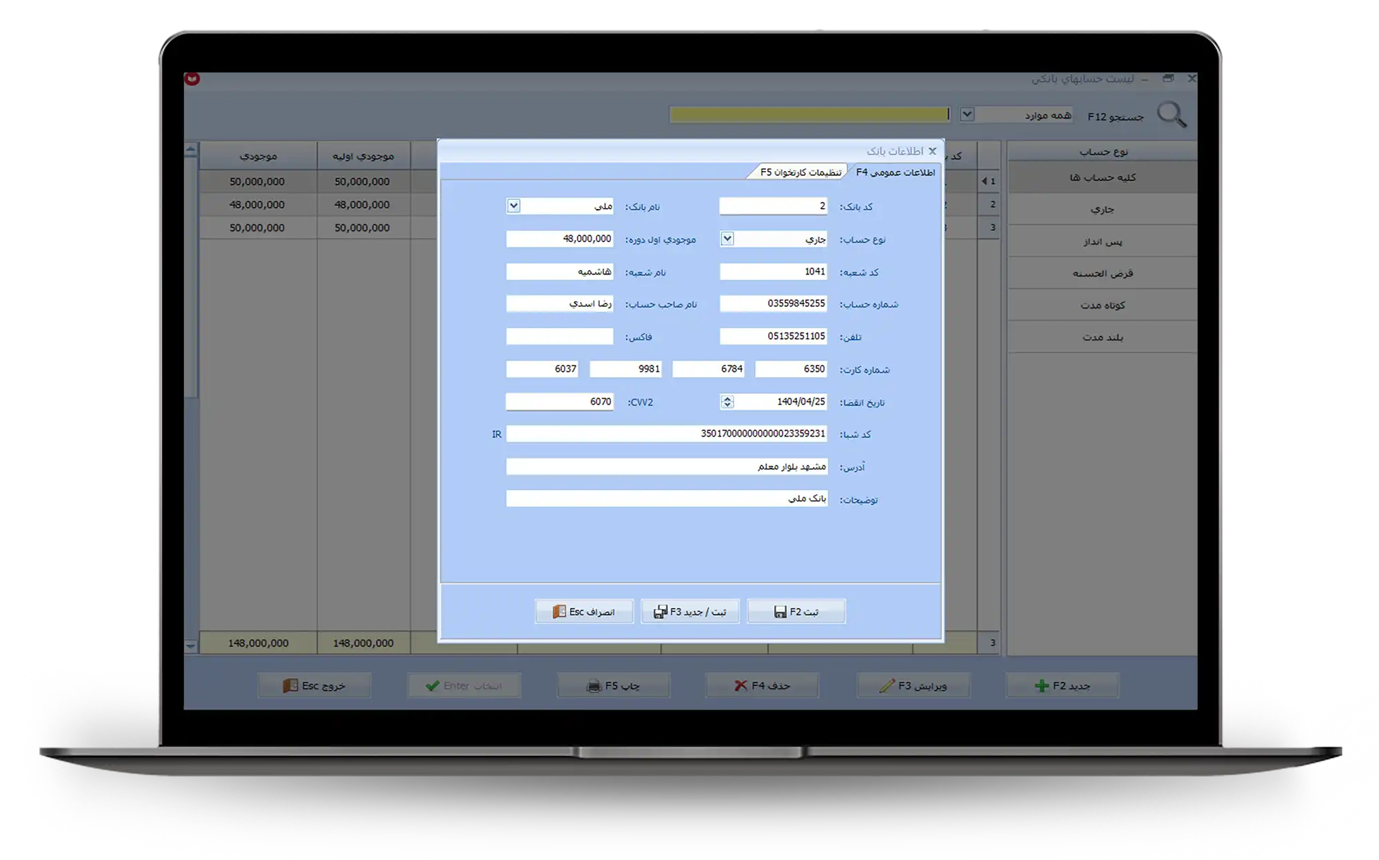- امکان تعریف دستگاه های کارتخوان (POS) برای هر حساب بانکی