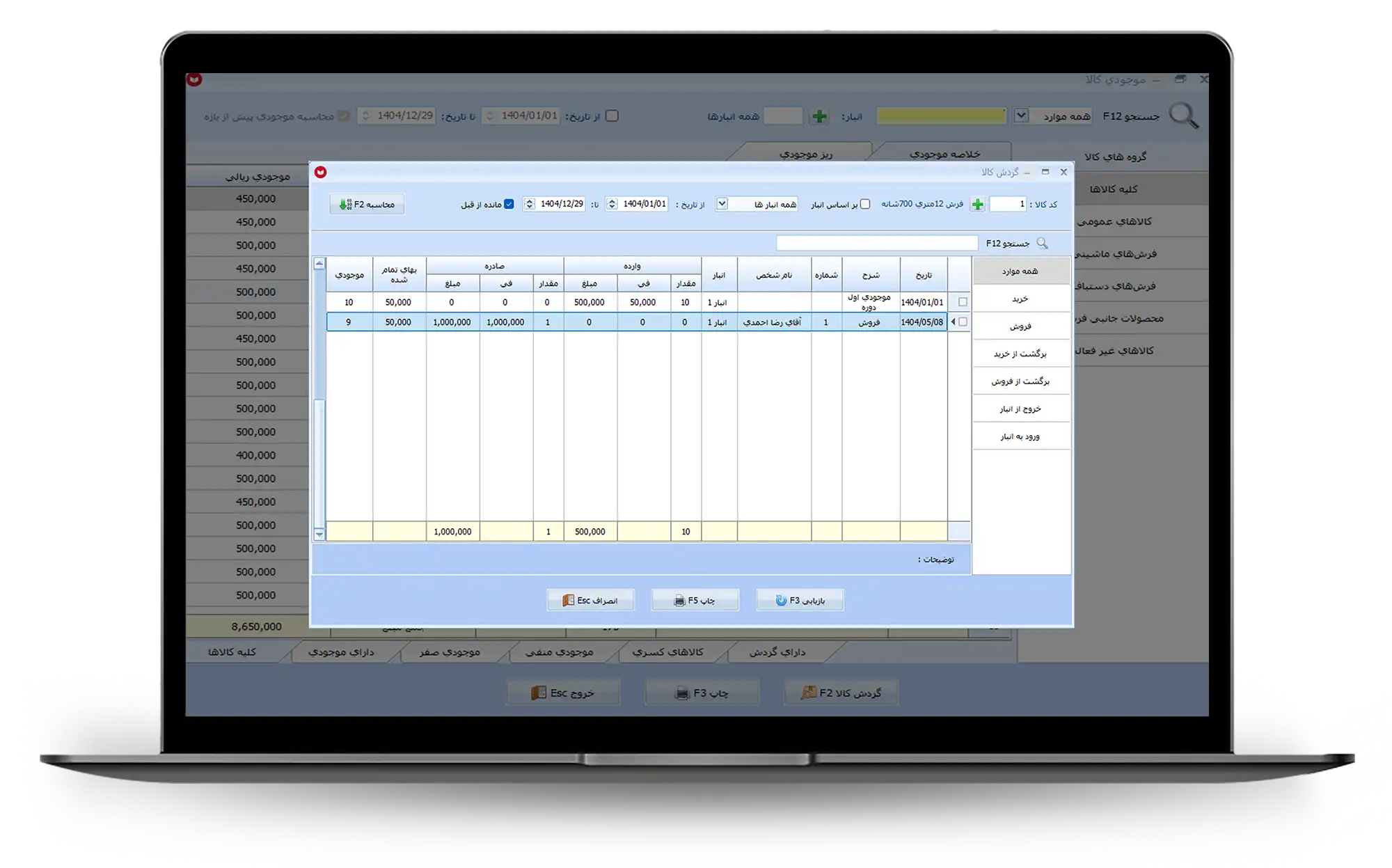 - ارائه گزارشهای متنوع مدیریت موجودی شامل موجودی انبارها، کالاهای بدون موجودی یا مازاد، کالاهای امانی و کاردکس کامل گردش کالا