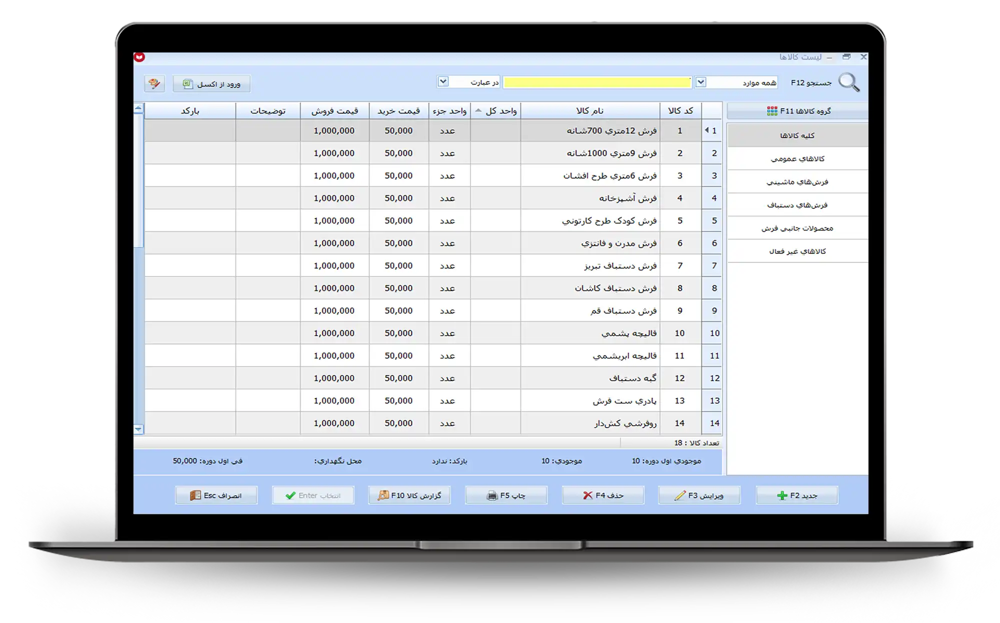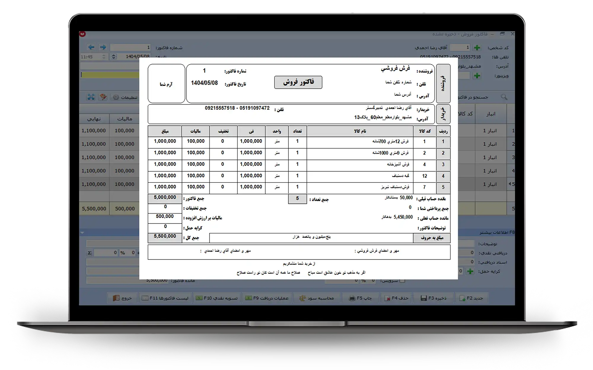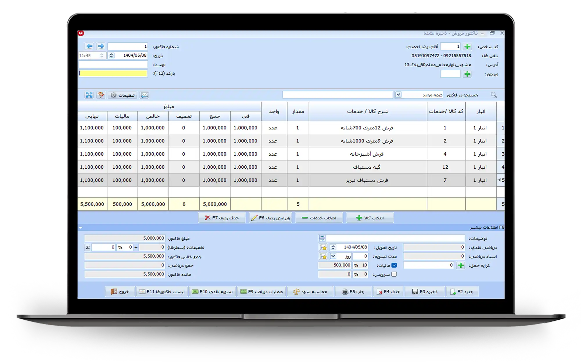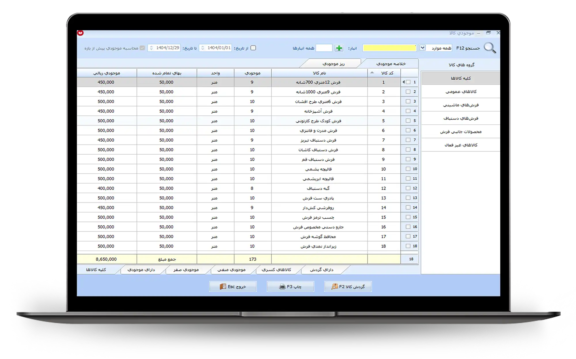- در نرم افزار حسابداری فرش فروشی مشخصات حرفه ای هر تخته مثل ابعاد، رنگ، طرح، تراکم و برند ثبت می شود تا جست وجو، ردیابی و گزارش گیری دقیق باشد. این ساختار از دوباره کاری جلوگیری کرده و سرعت فاکتور نویسی را بالا می برد. برای فروش دستباف، ماشینی و موکت همزمان جواب می دهد