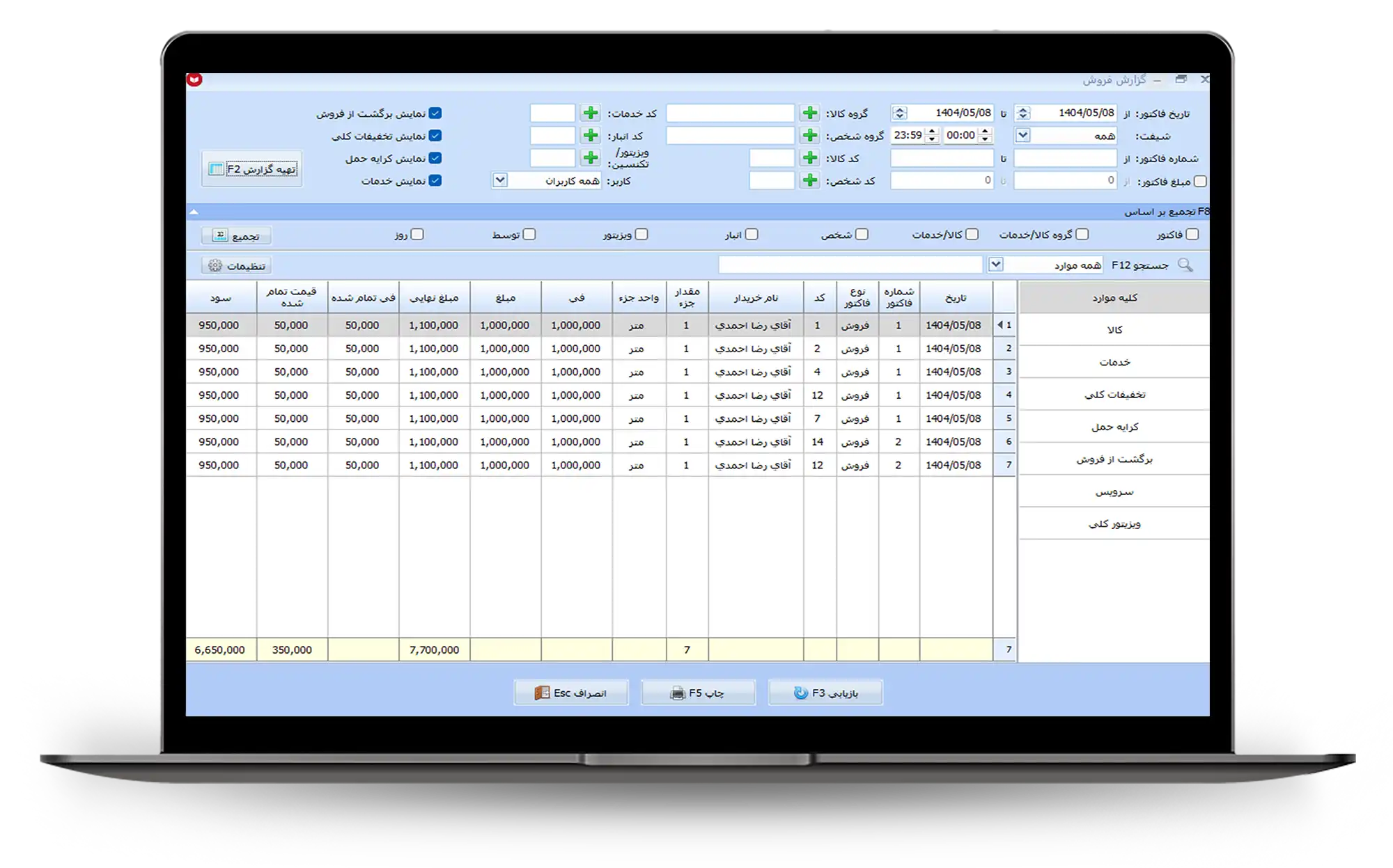 - امکان ارائه گزارش فروش به تفکیک یک مشتری خاص یا همه مشتریان