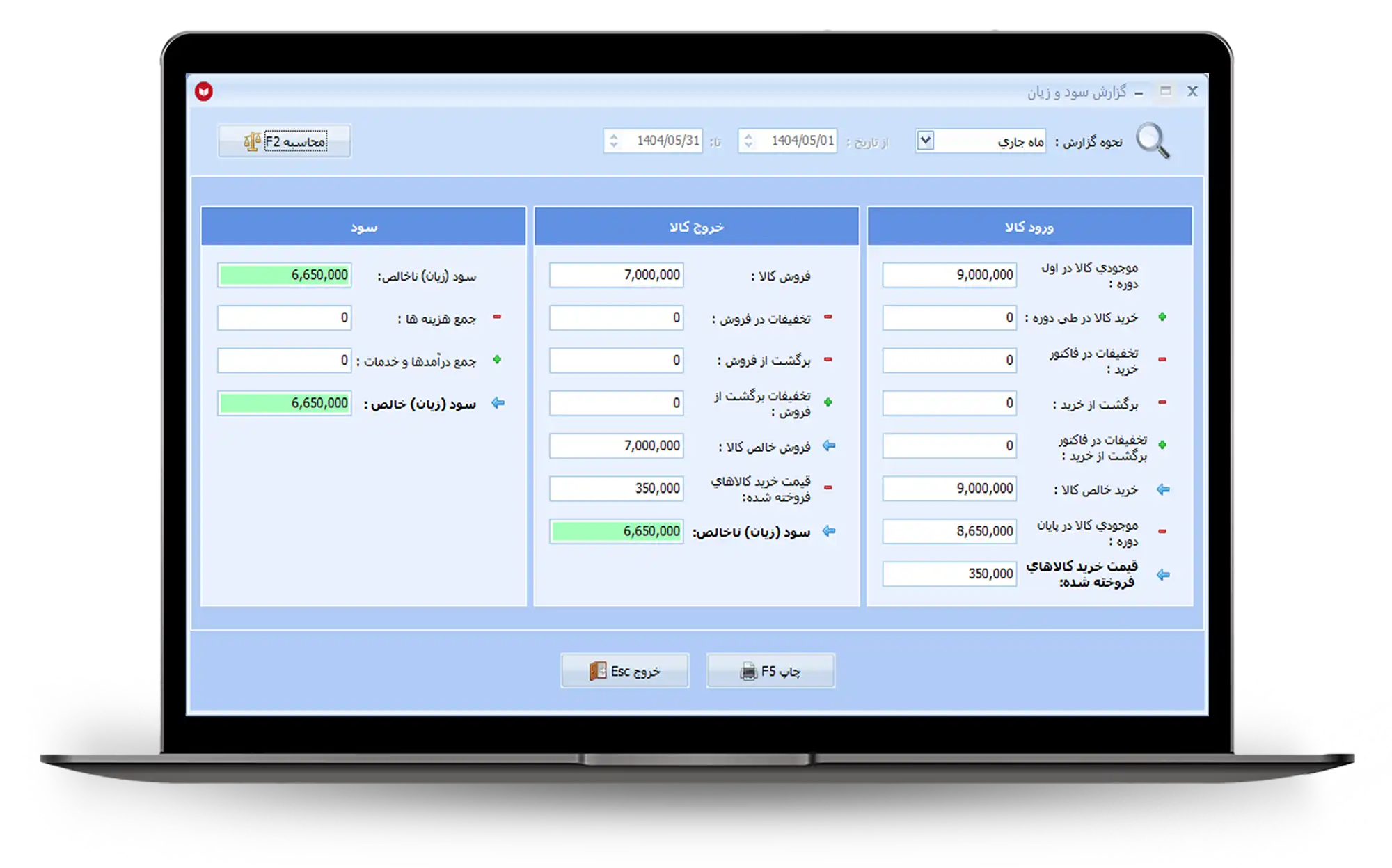 - امکان ارائه گزارش فروش روزانه، ماهانه یا بین دو تاریخ مشخص (همراه با نمایش حاشیه سود هر فاکتور)