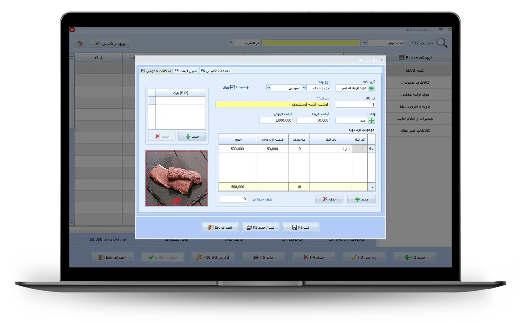 - با نرم افزار حسابداری کبابی و جگرکی میتوانید موجودی انواع گوشت، جگر، مرغ و سایر مواد اولیه را مدیریت کنید. سیستم هشدار کمبود موجودی همیشه شما را بهروز نگه میدارد.