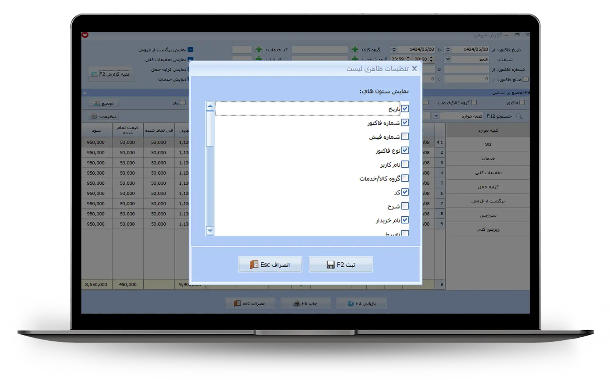 - امکان ارائه گزارش فروش روزانه، ماهانه یا بین دو تاریخ مشخص (همراه با نمایش حاشیه سود هر فاکتور)