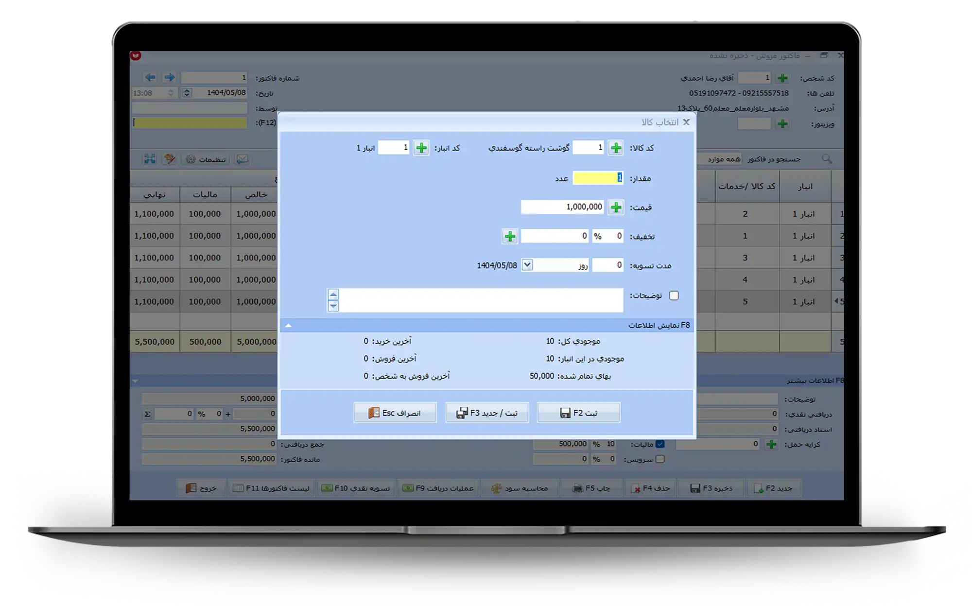 - صدور و مدیریت انواع فاکتور فروش و خرید با امکان تغییر قیمت کالا ها حین صدور فاکتور