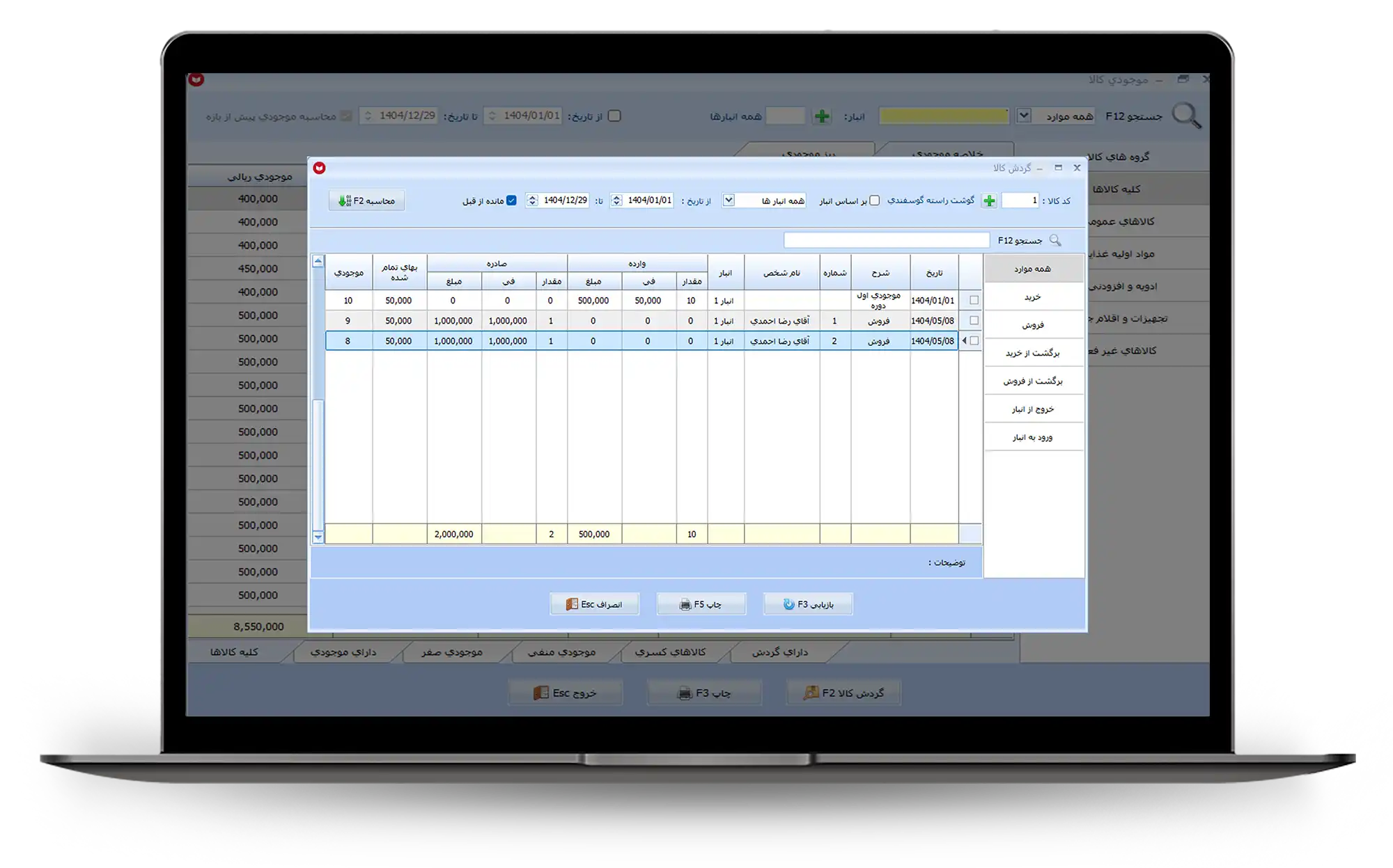 - ارائه گزارشهای متنوع مدیریت موجودی شامل موجودی انبارها، کالاهای بدون موجودی یا مازاد، کالاهای امانی و کاردکس کامل گردش کالا