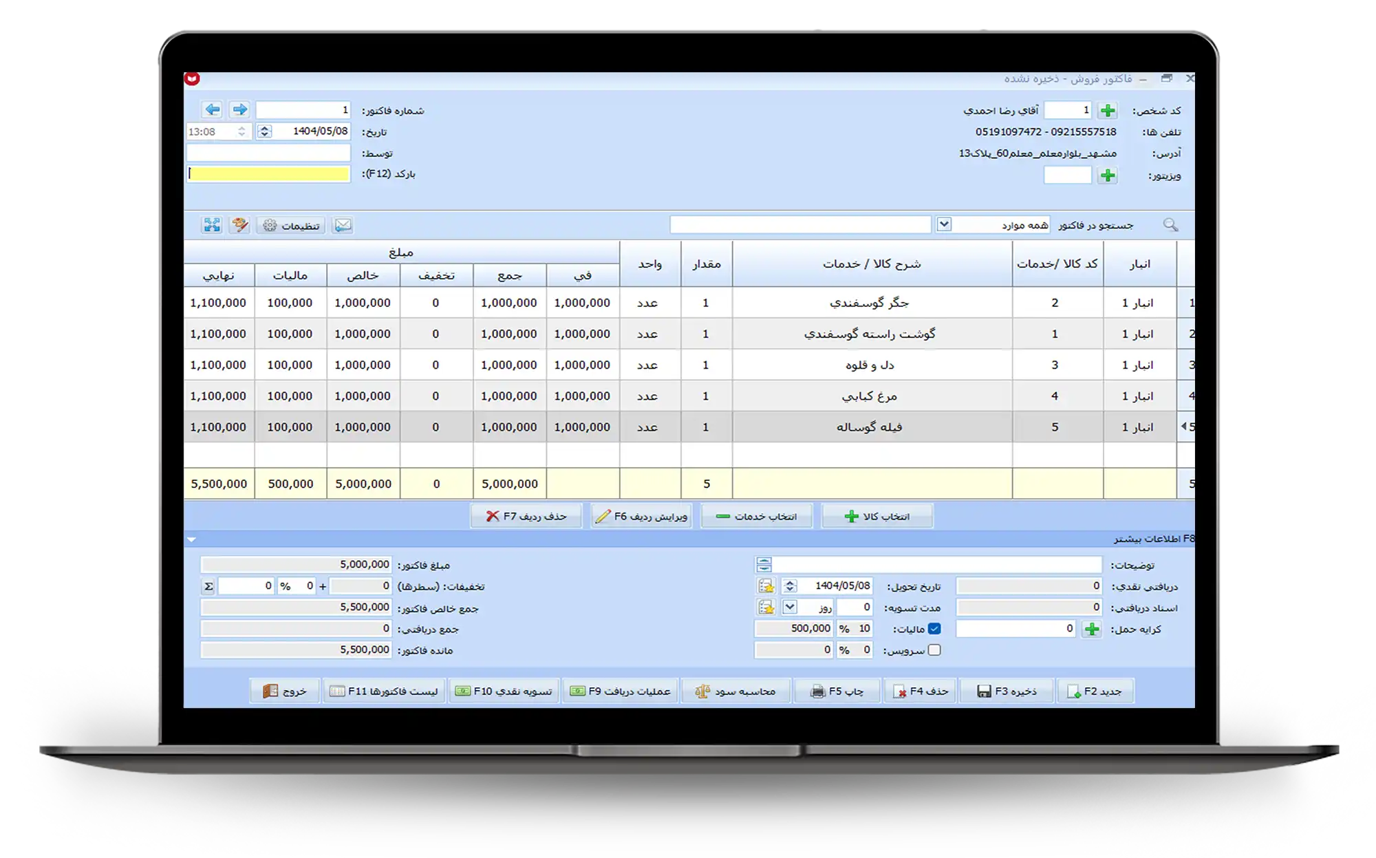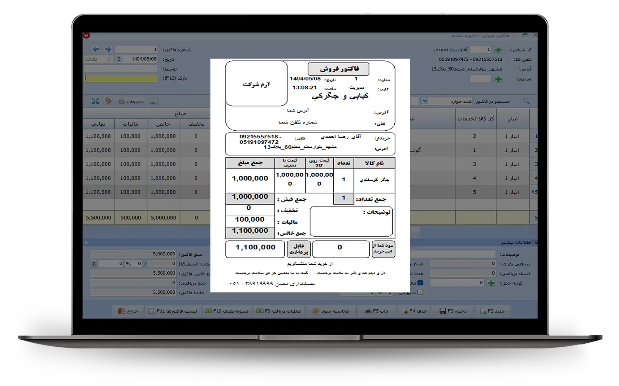 - چه فروش نقدی باشد و چه اعتباری، حساب مشتریان بهطور کامل ثبت و مدیریت میشود. امکان تعریف مشتریان ثابت و ارائه تخفیف نیز وجود دارد.