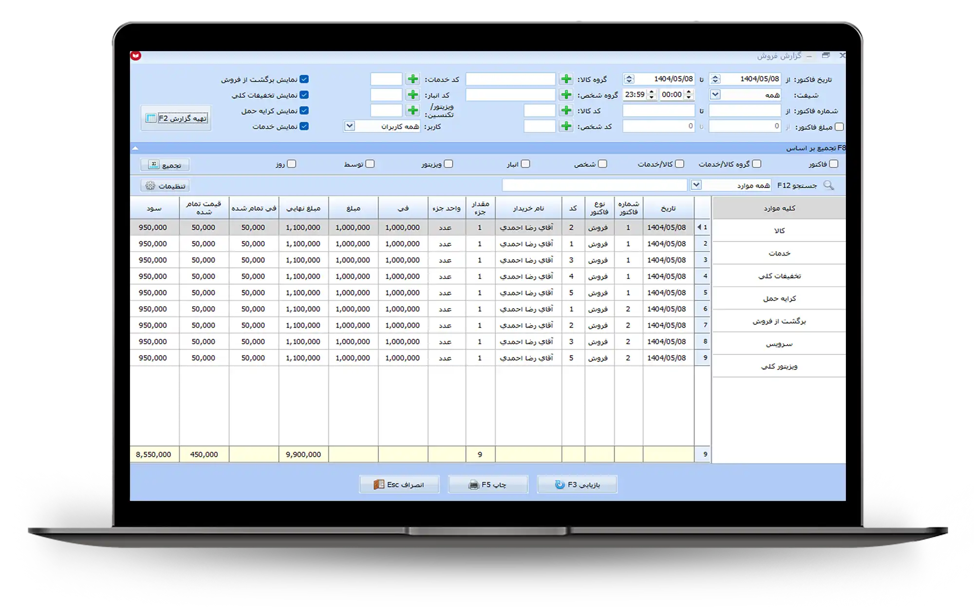- امکان ارائه گزارش فروش به تفکیک یک مشتری خاص یا همه مشتریان