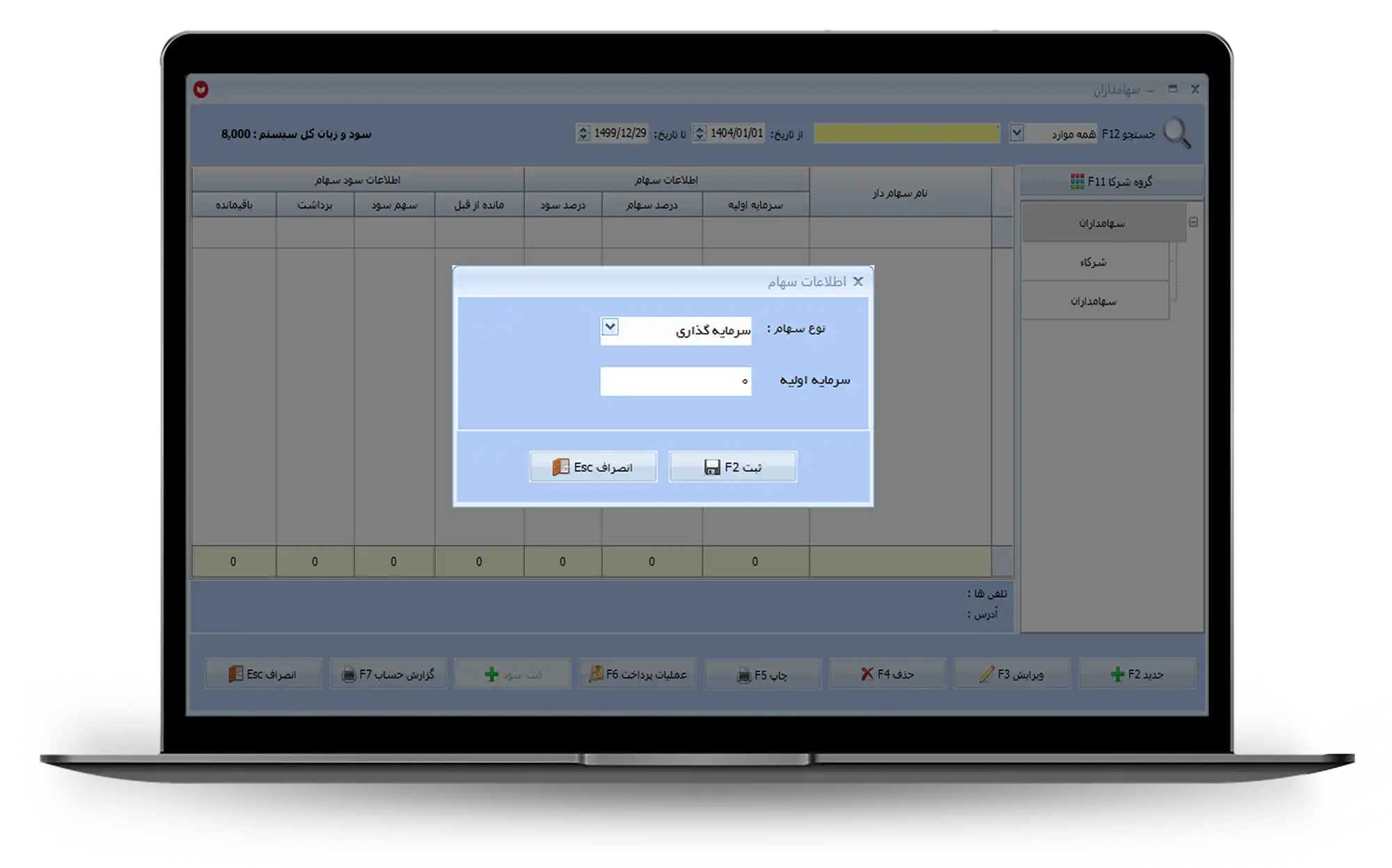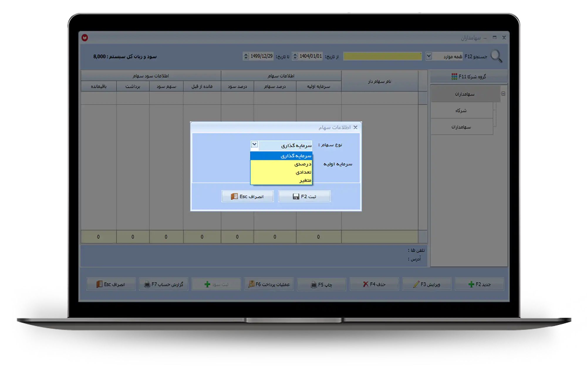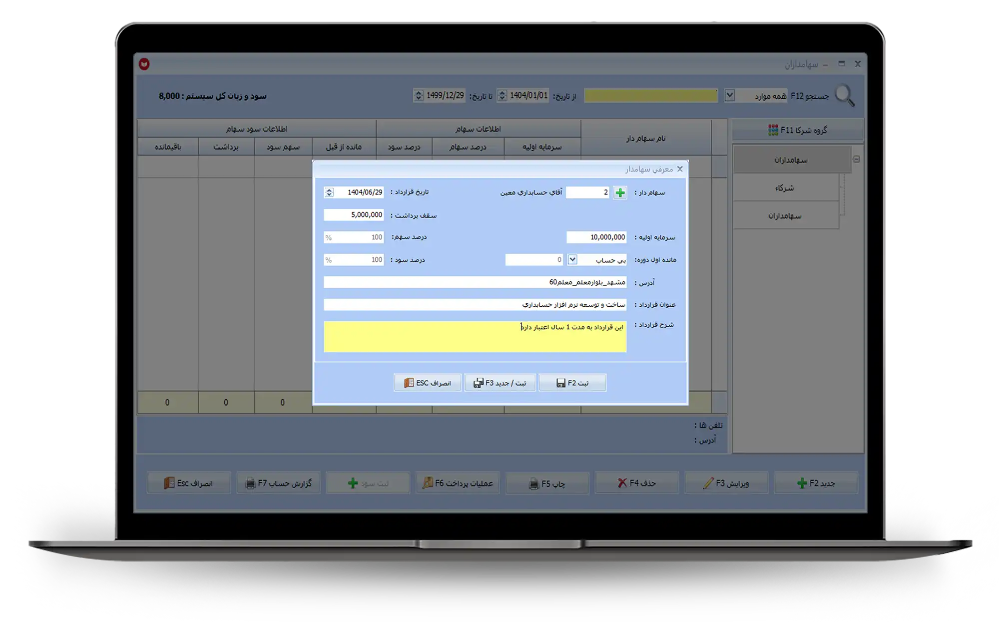 - اگر یکی از شرکاء سرمایه خود را افزایش دهد یا تغییراتی در سهام ایجاد شود، بهراحتی میتوانید این تغییرات را در سیستم ثبت کرده و محاسبات بهروز انجام شود.