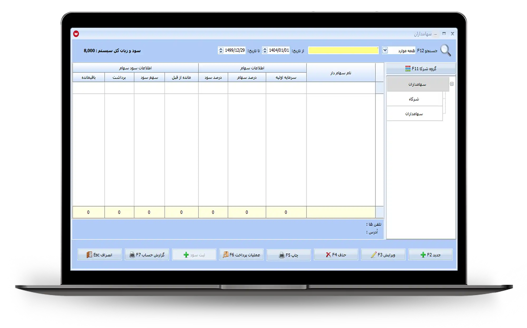 - امکان مشاهده و چاپ گزارشهای دقیق از وضعیت سرمایه، سود انباشته و سهم هر شریک در بازههای زمانی مختلف وجود دارد. این گزارشها ابزار مهمی برای تصمیمگیری مدیران و سهامداران هستند.